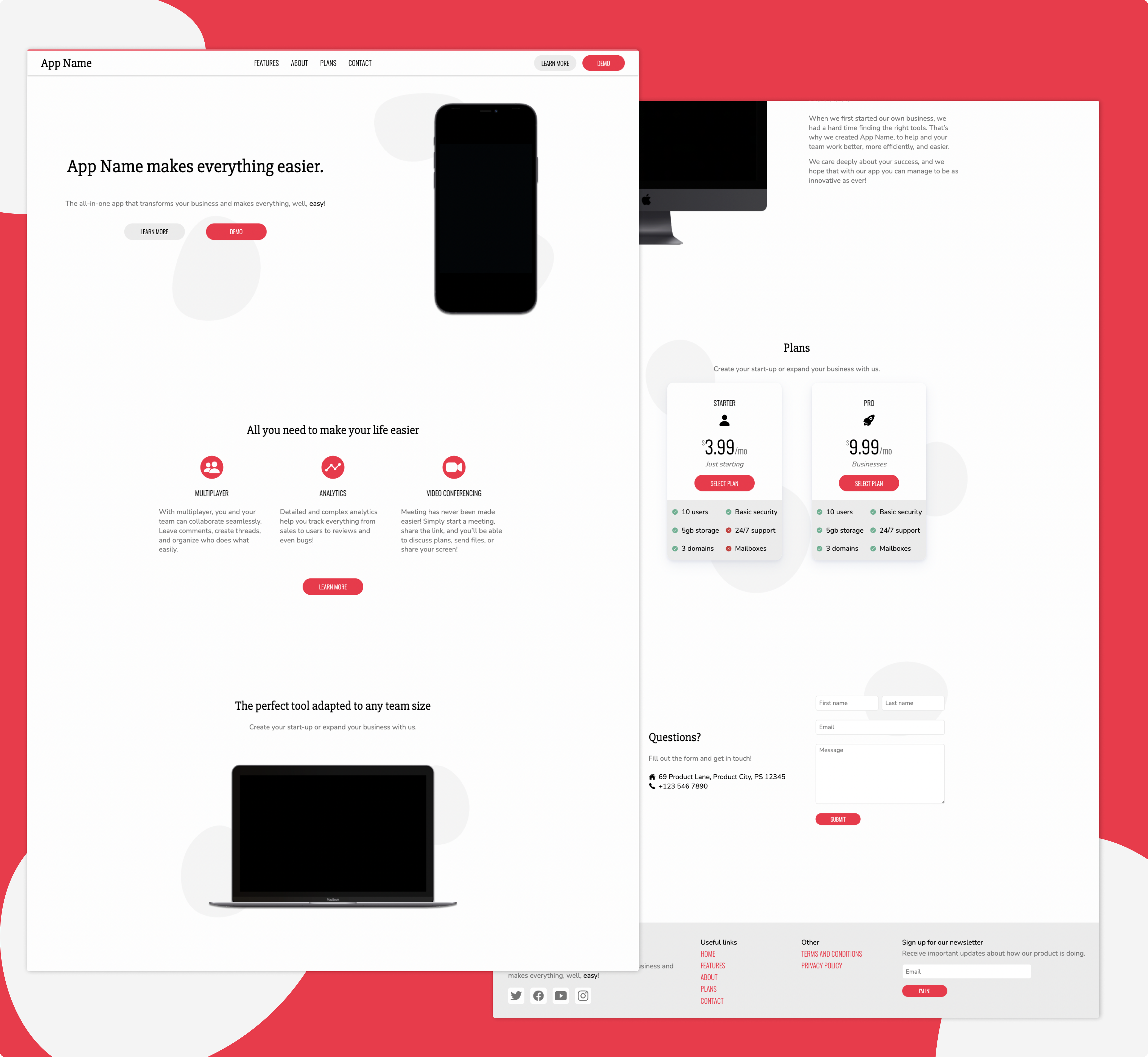 The product page of an app! A sort of template that you can use to showcase and present your app, with multiple pages/sections like landing, features, sign up, about us, and much more!