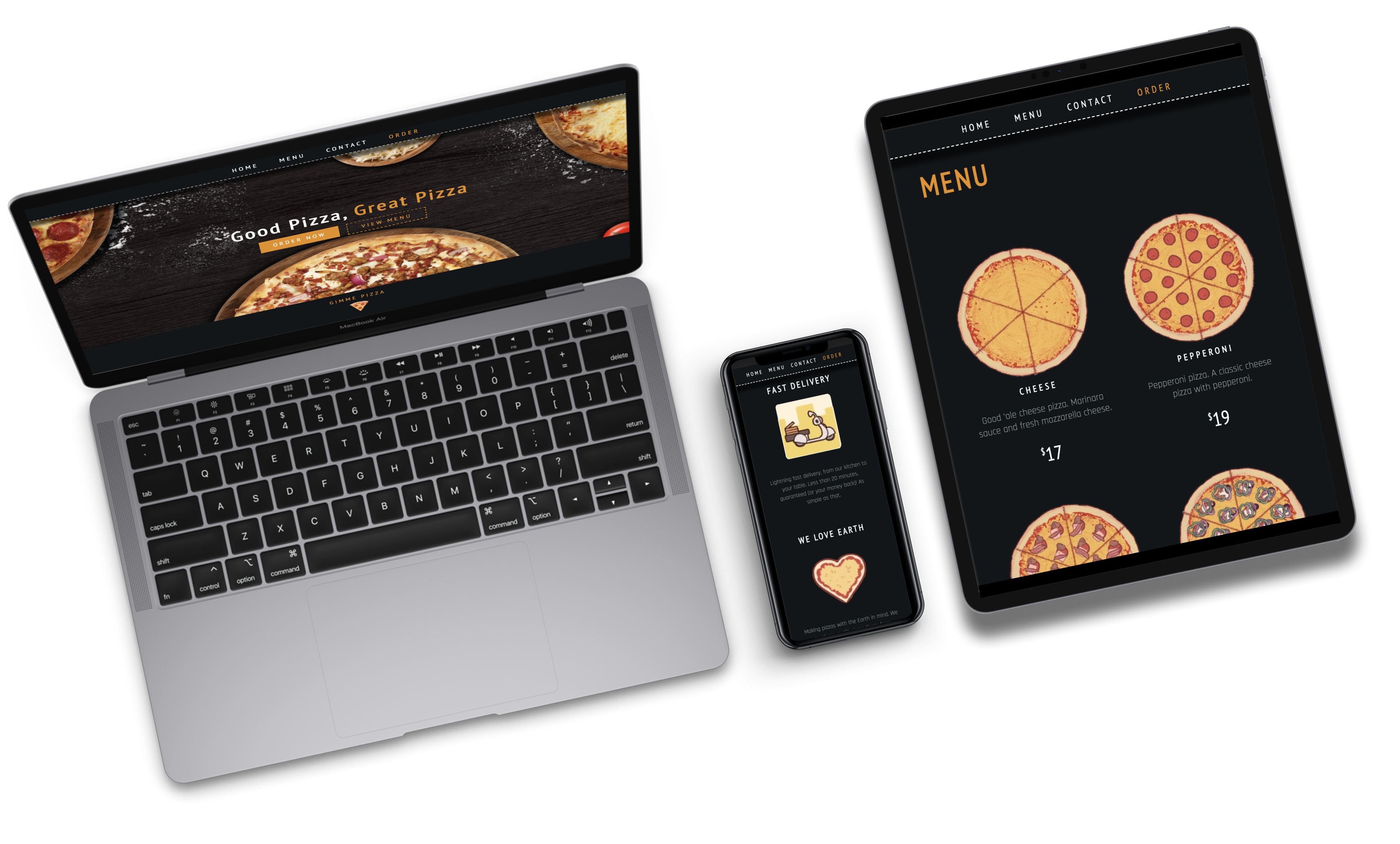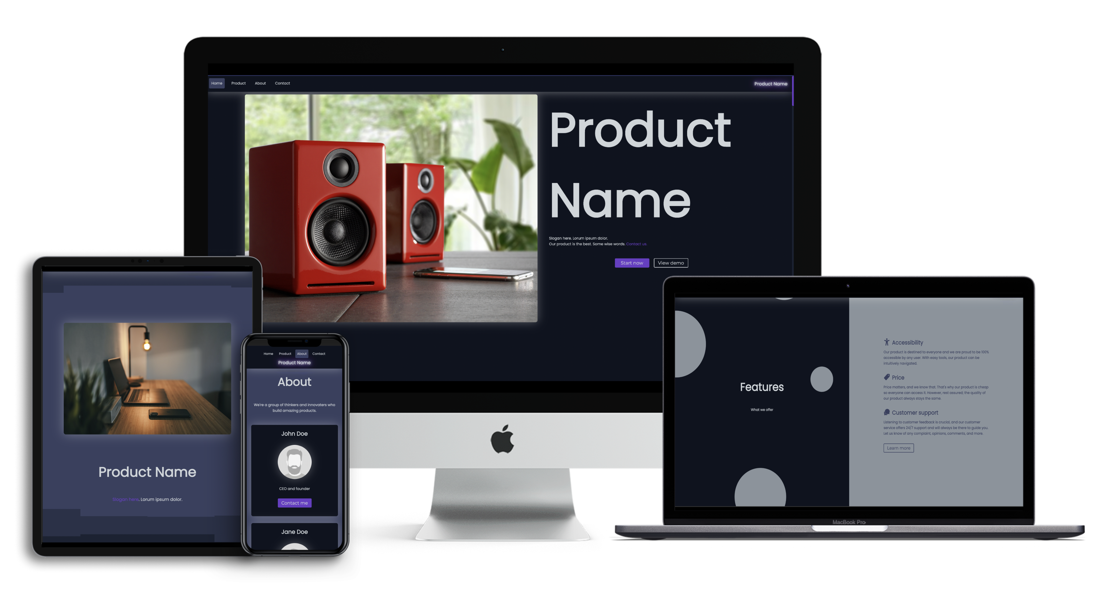 Is also completely responsive, and includes media such as device wireframes or icons.
